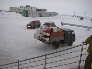 Out of the building, one by one, our boxes were freed to go! We stashed them as high as we could on the flat bed of a Russian truck and watch the driver vanishing into the dusk, telling us to come and find them on Monday inside the Chukotavia airline hanger.